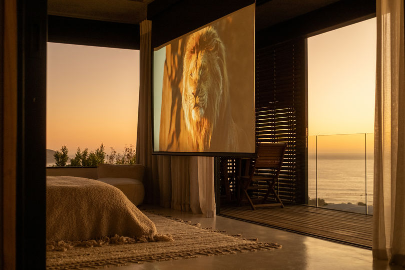 As night falls, a large screen descends from the ceiling, turning your bedroom into an intimate movie theater, accompanied by the soothing sound of waves just outside your window.